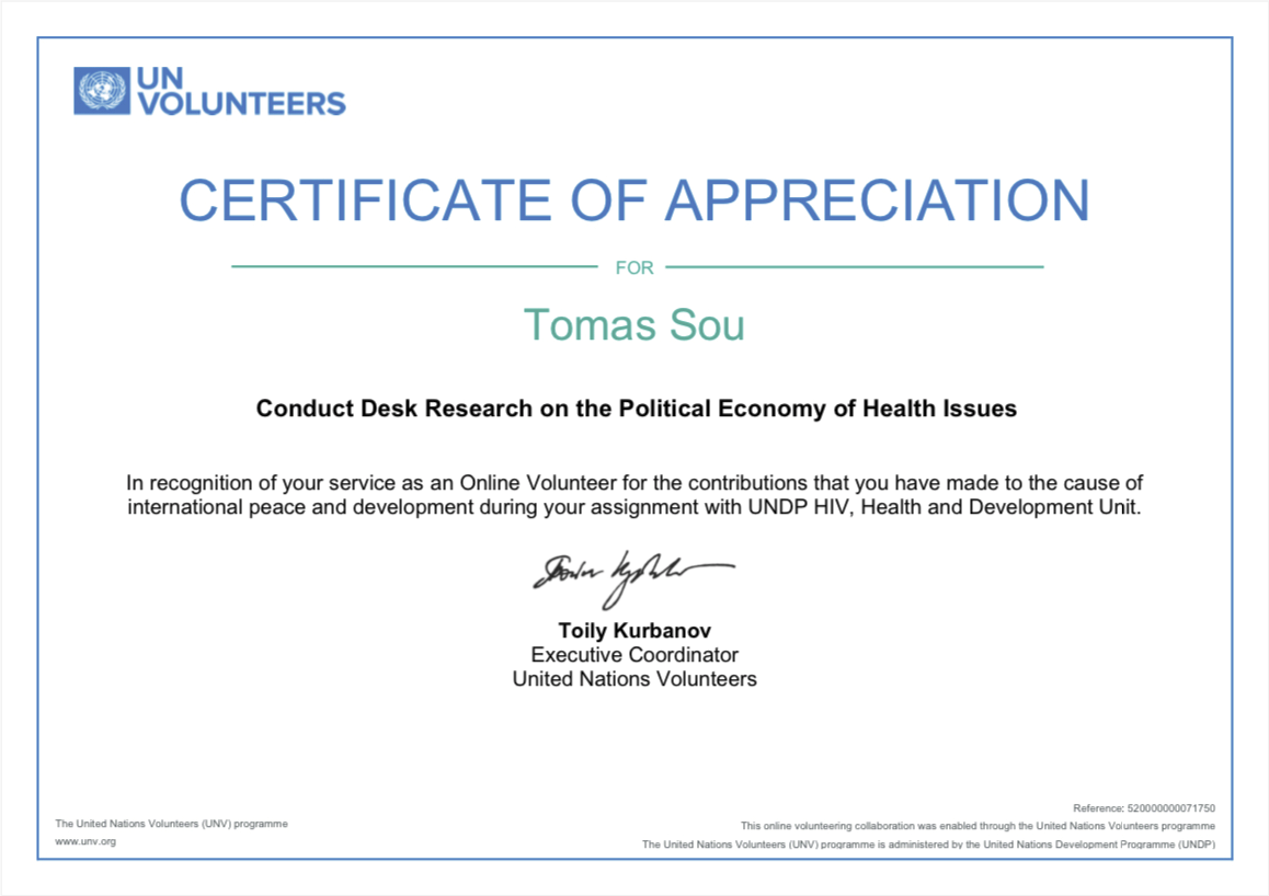 In the UNV programme, I supported research on the political economy of health issues for the United Nations Development Programme (UNDP).